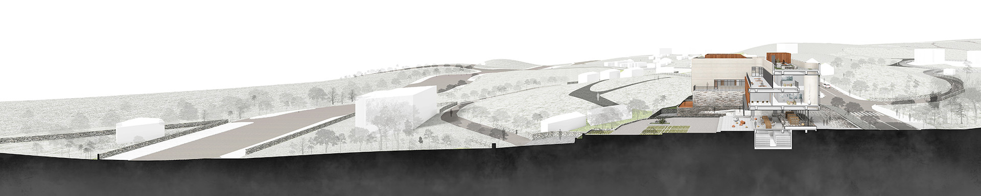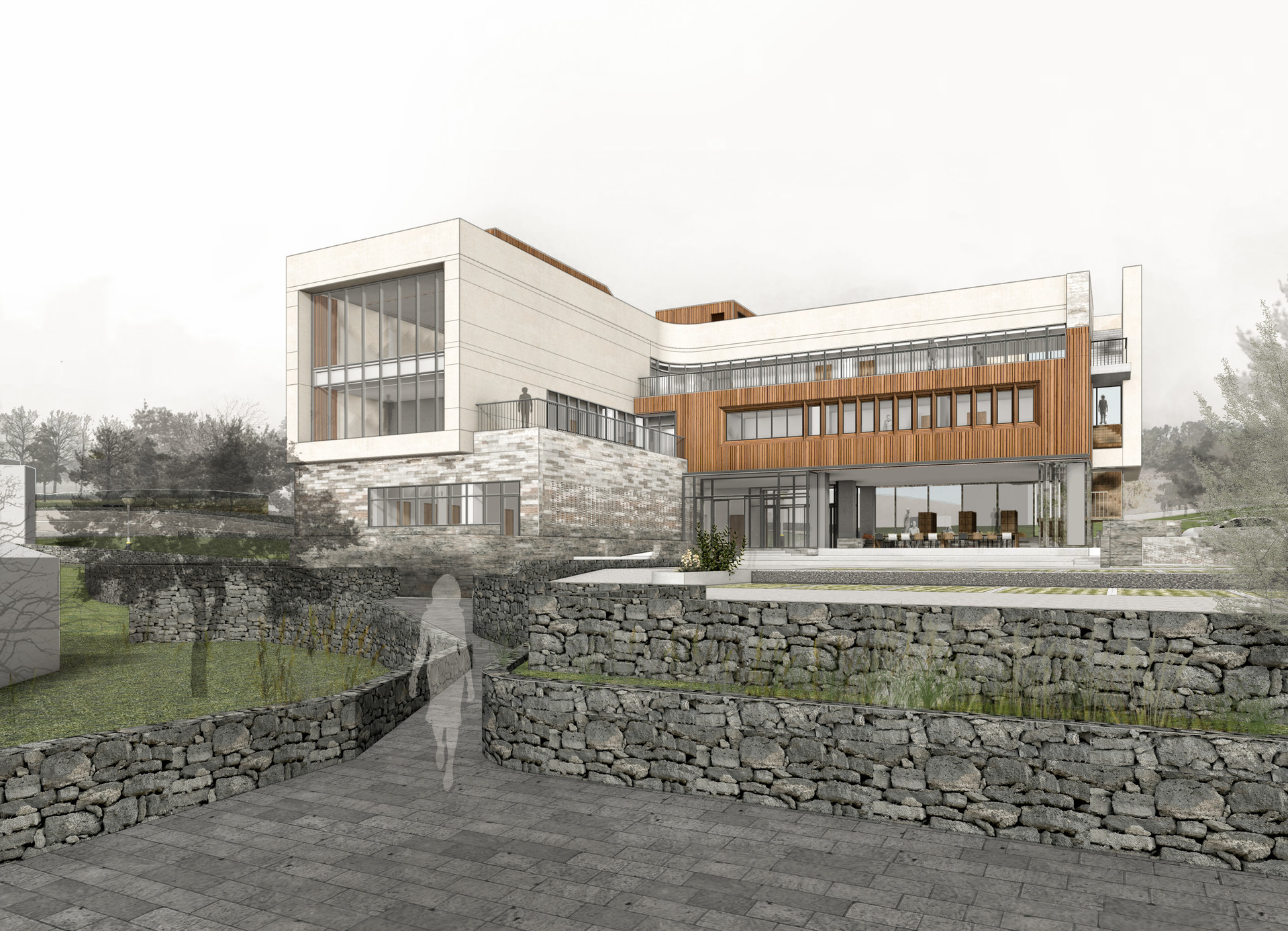 These spaces are designed to maximize transparency, creating open areas where the boundaries between spaces and between the interior and exterior are ambiguous. The pond at the entrance of the building welcomes visitors, while the stepping stones provide a place to rest. The stone walls that connect the paths of the village vary in size and height according to their function, serving as fences that continue the horizontal circulation, toetmaru where one can sit and rest or have a conversation, and vertical walls that guide the vertical movement, connecting the open spaces.