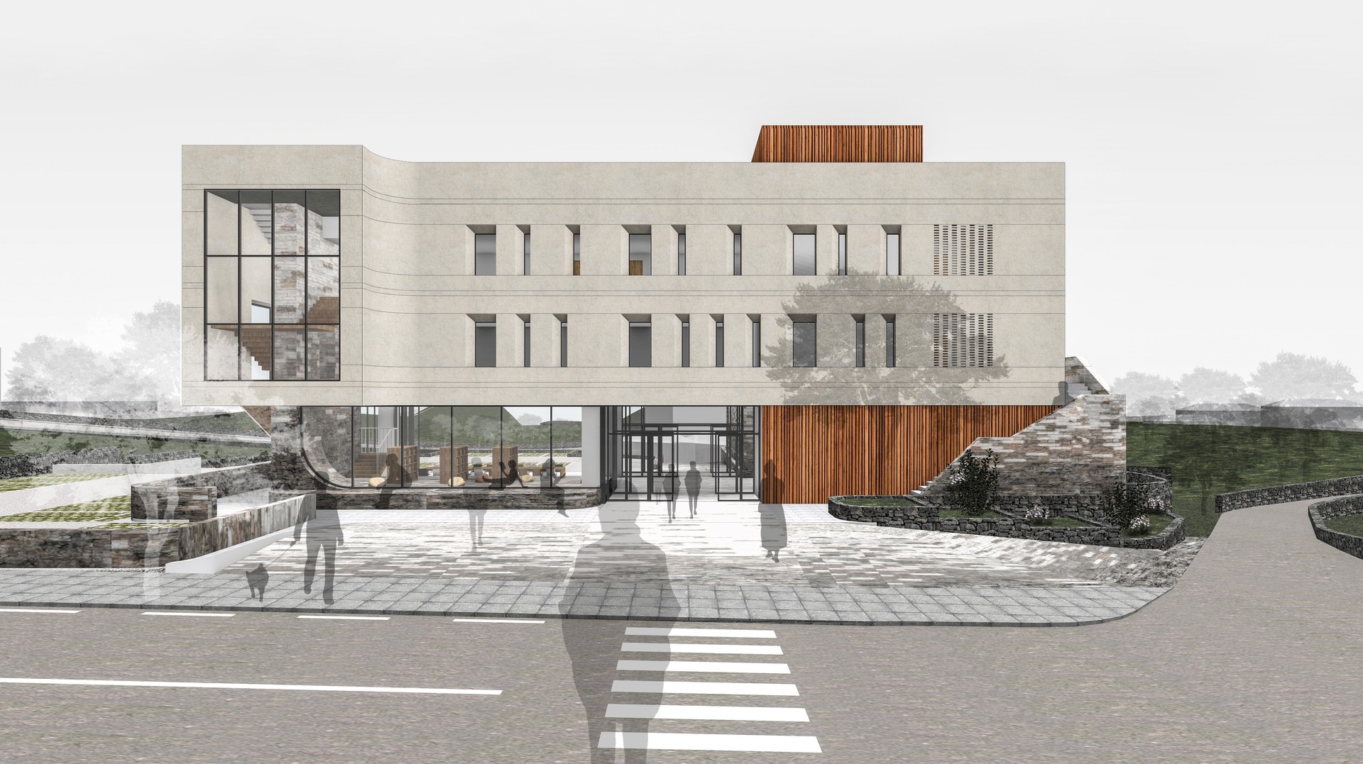 The expansive entry courtyard located at the intersection of village paths lined with stone walls, the lobby infused with the essence of the Olle trail’s fences, the book cafe connected by inner and outer toetmaru (a traditional Korean wooden porch), and the multi-purpose courtyard linked to the book cafe serve as spaces for the villagers and tourists passing through Yerae to rest and converse. These areas foster everyday encounters and host a variety of events against the backdrop of Yerae-dong’s beautiful natural scenery.